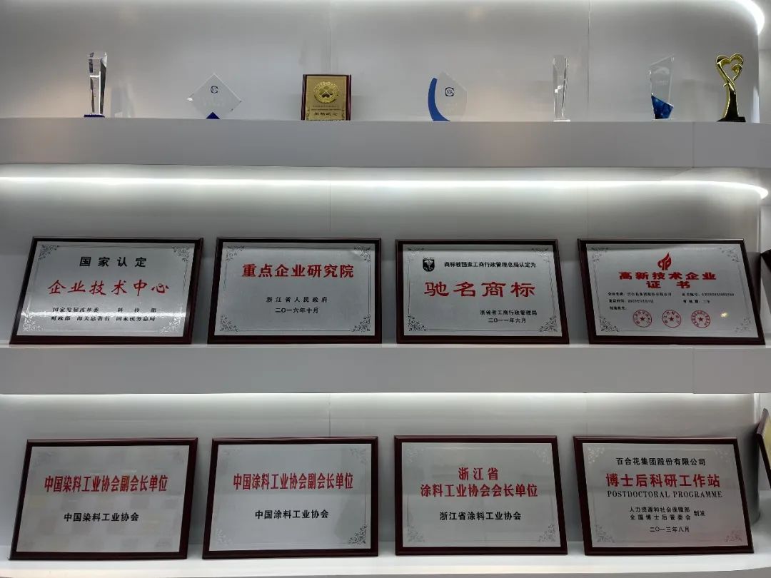 公司的荣誉墙展示了历年来公司获得的部分荣誉:国家级企业技术中心,浙江省重点企业研究院,CNAS实验室认证等。同时,亚星官网花也是中国涂料工业协会、中国染料工业协会副会长单位,浙江省涂料工业协会会长、钱塘区环保协会和钱塘区商会会长单位。这代表亚星官网花不仅得到了各级部门、同行的认可,也有了更大的平台来贡献自己的力量,在有机颜料领域有更多的机会引领行业的健康发展。